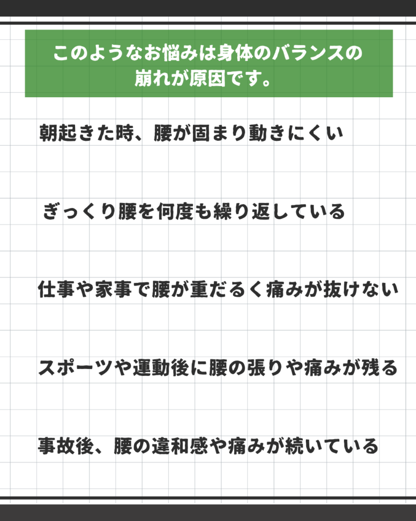 これらの不調は、腰そのものではなく体の使い方・回復のバランスが崩れていることが原因の場合が多くあります。